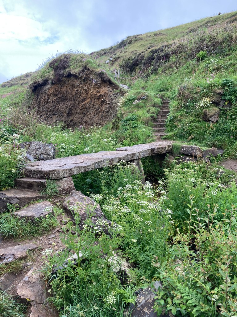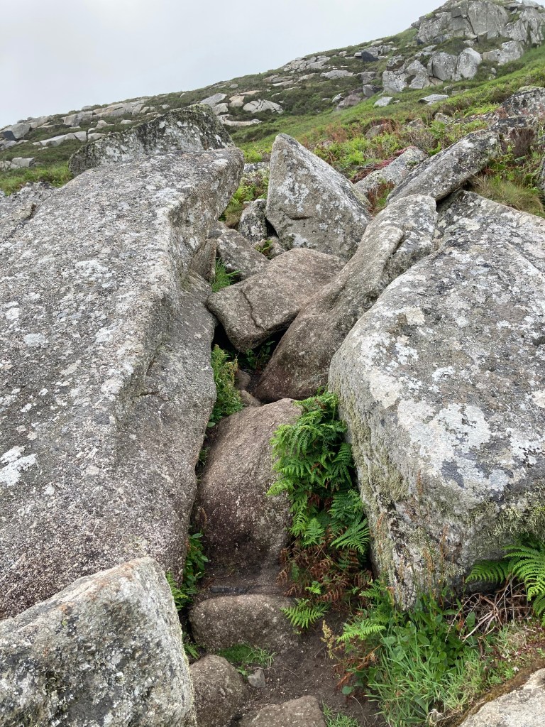 This little piskie “conceit” is now actually starting to scare the crap out of me. I toil on, the path sometimes going up streams (literally) and after three hours, I finally see someone coming in the other direction. We pause to talk and they tell me that there’s a “bit of a scramble” ahead. I’ve already been through a couple of sections described that way and they weren’t a problem, so I laugh and say I’ll be careful. My laughter is clearly heard by the piskies, who are probably pissing themselves as they watch me navigate the “scramble”.