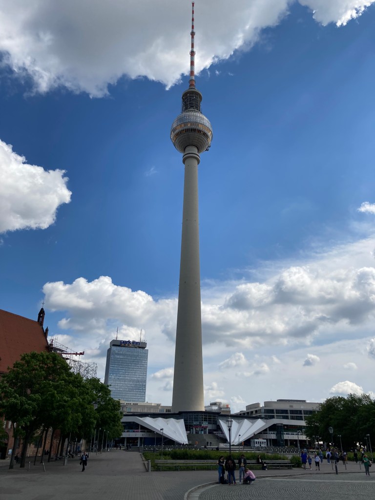 I spot a chemists and manage to stock up on sun tan lotion and shower gel. Great service – the lady also gives me some vitamin C tablets and a pack of tissues to wipe the lotion away from my eyes. I find a place near the Fernsehturm to apply the lotion to the skin.