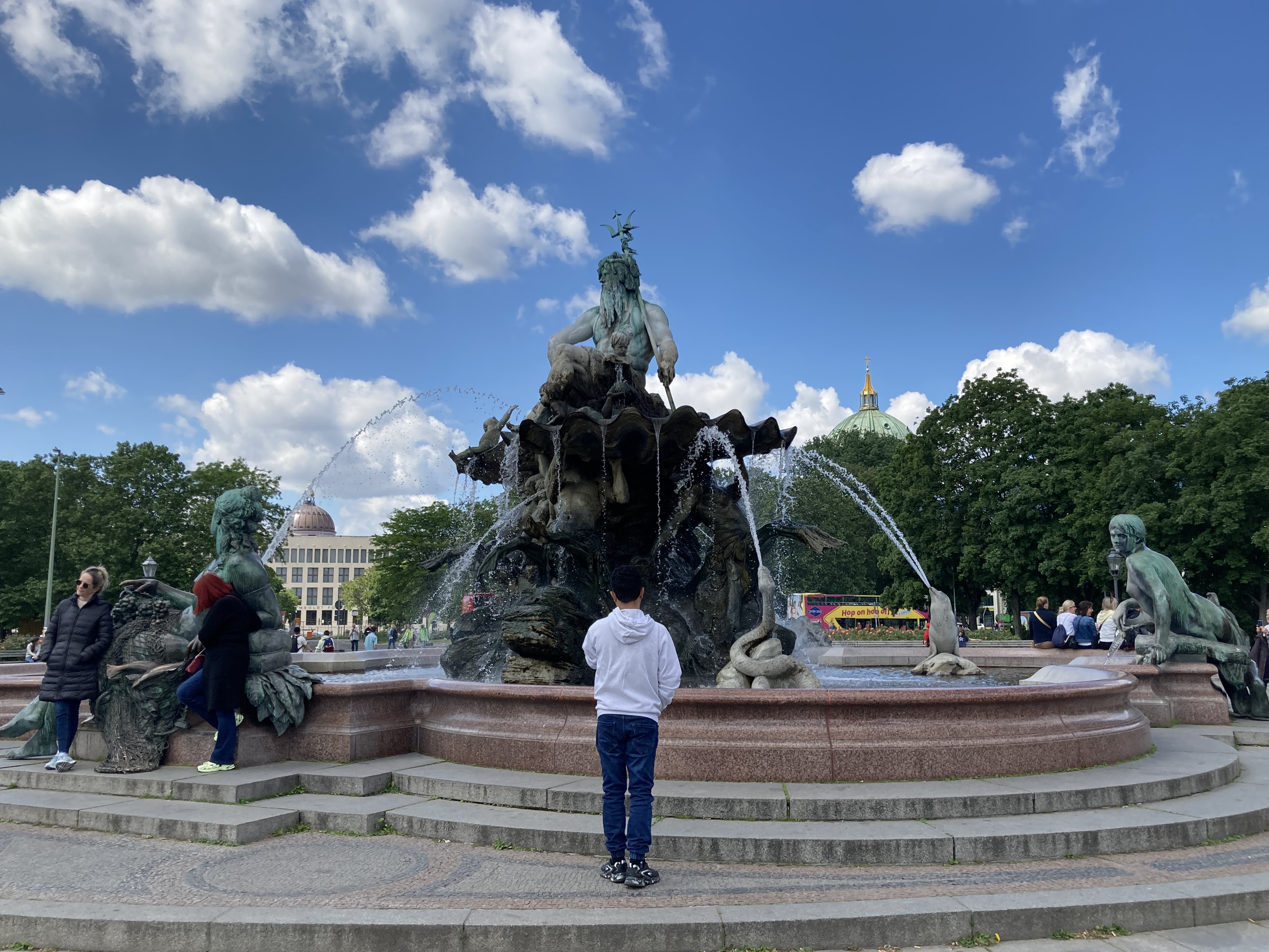 The threatened poor weather has failed to appear. In fact, it’s sunny and warm and I’m keeping an eye out for somewhere to buy suntan lotion. I haven’t found one by the time I approach the Fernsehturm via the Neptune Fountain.