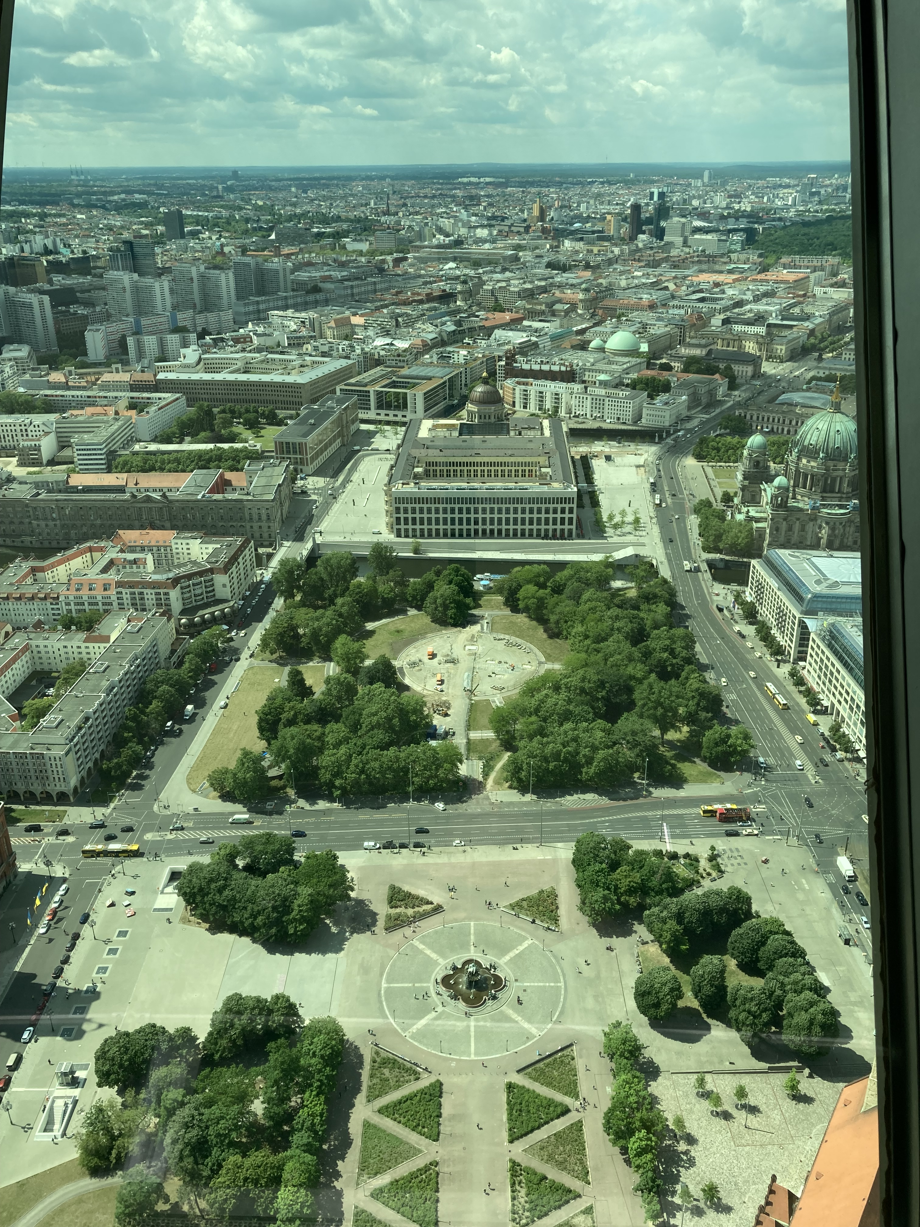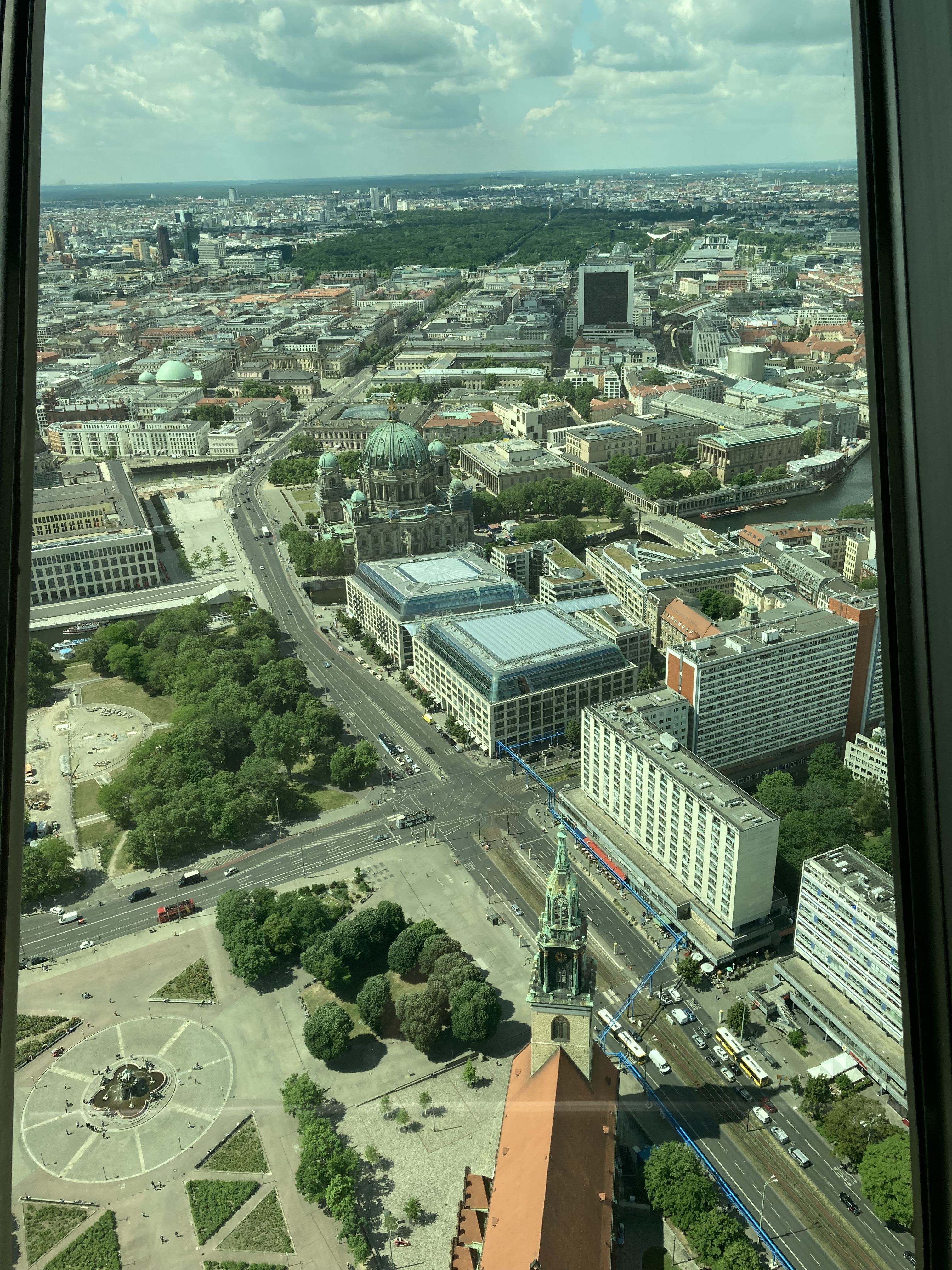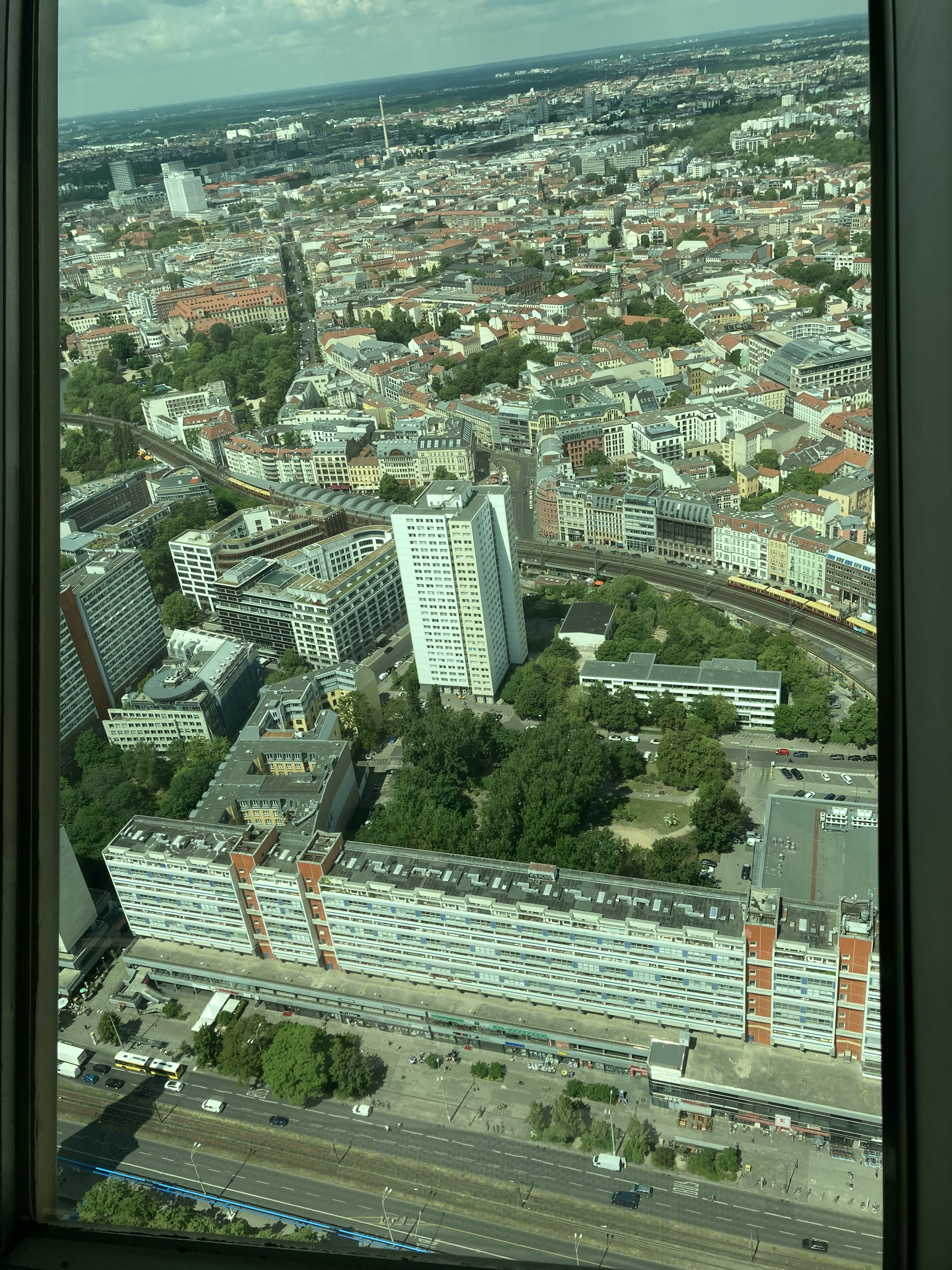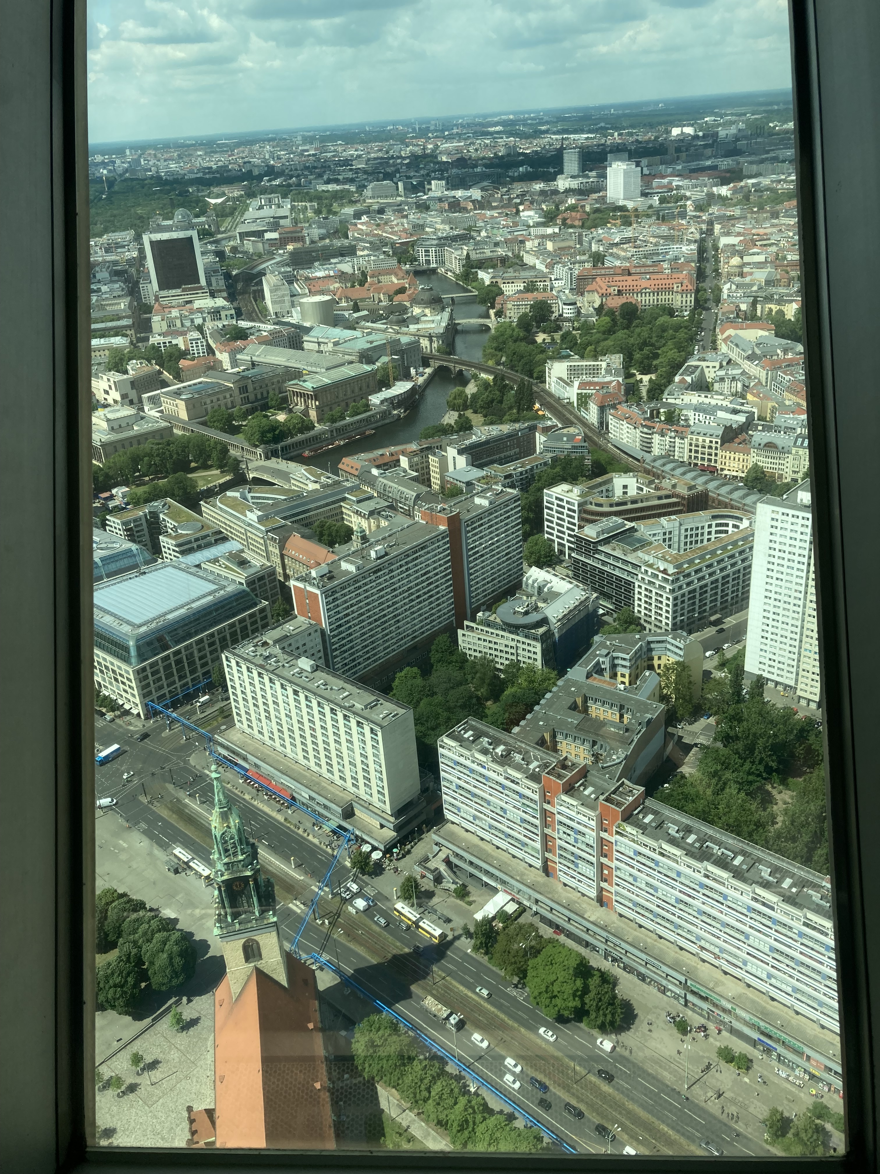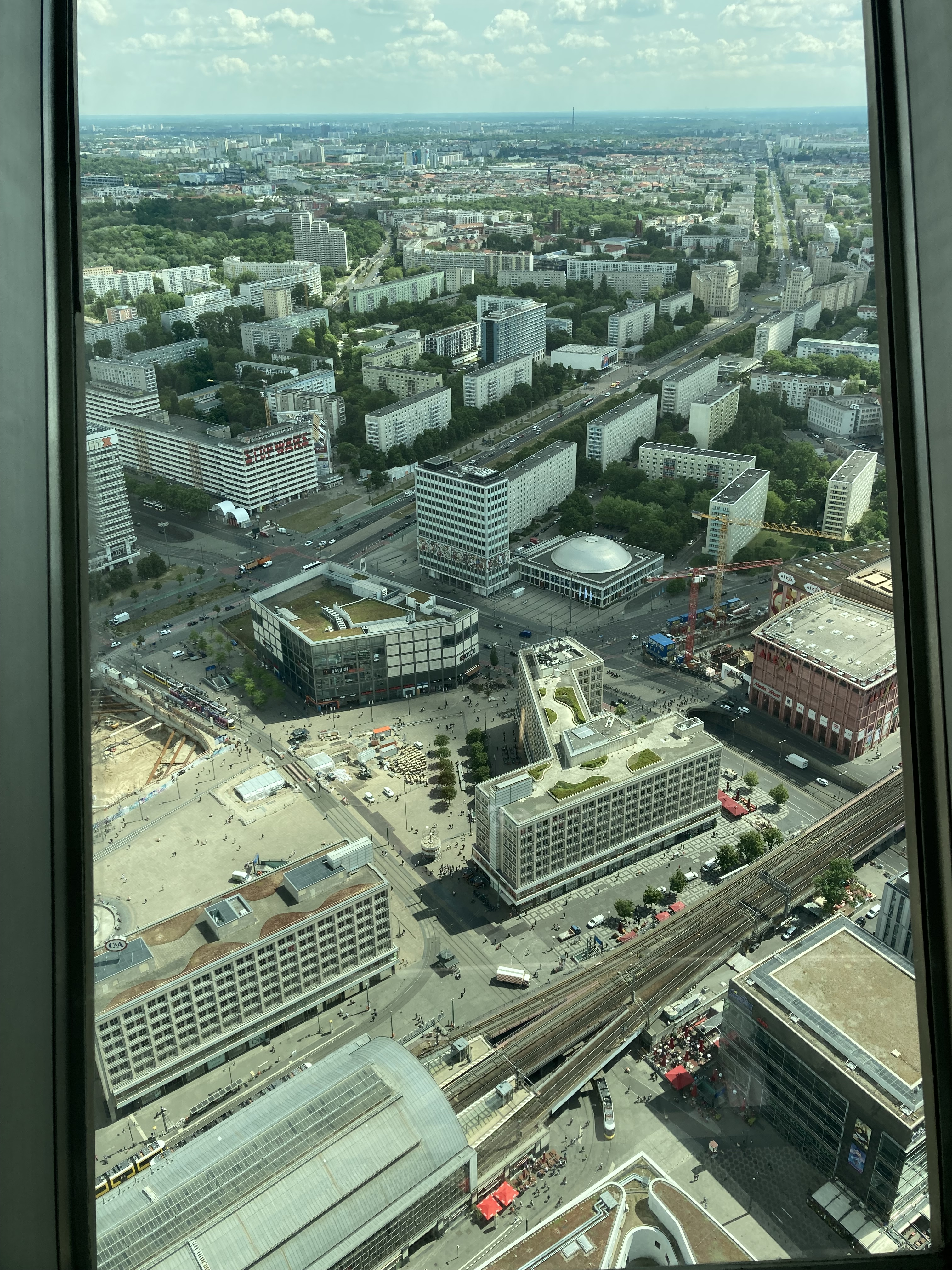 On to the Fernsehturm. I decided not to pay for the 3D visual experience and just head upstairs, where I wrangle my way through security. There, the security guard asks me to empty my bag – which turns out to be quite embarrassing as on top are 2 empty plastic water bottles and a used tissue. They are followed by sun tan lotion, shower gel, charger and cable, iPad mini, Age-Appropriate Hoody… at that point she gave up and waved me through. At least we didn’t get as far as the cheese roll, which I’m reminded of as someone on Facebook has commented on my gargantuan breakfast.